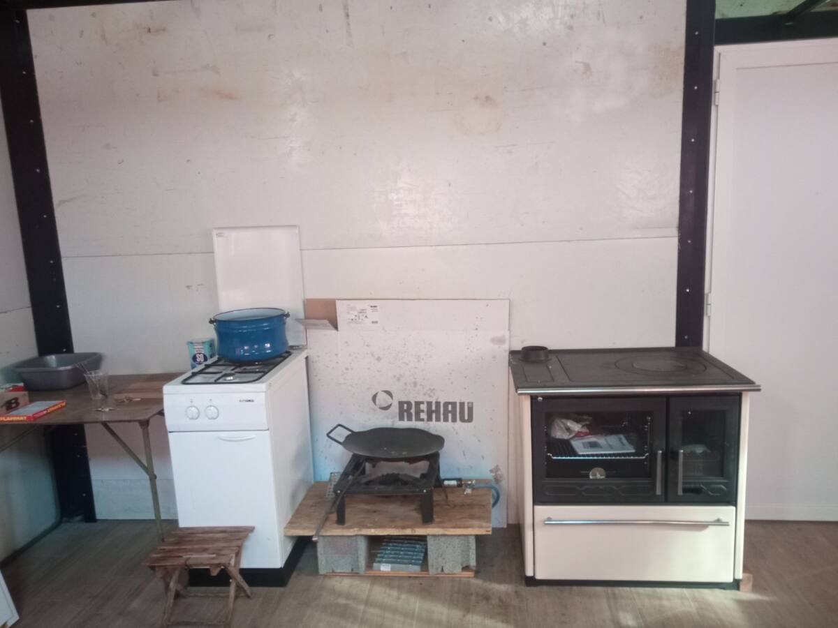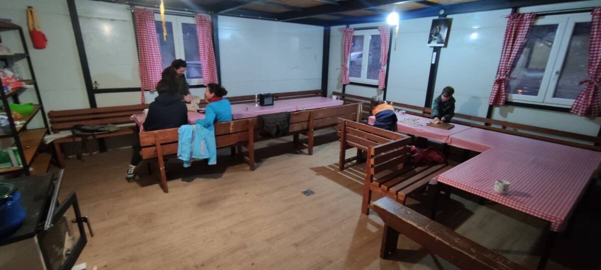 Kuhinja u domu privremeno je opremljena plinskim šporetom i šporetom na drva koji ujedno služi i za zagrijavanje trpezarije i spavaone. U spavaonu na spratu trenutno se može popeti merdevinama.