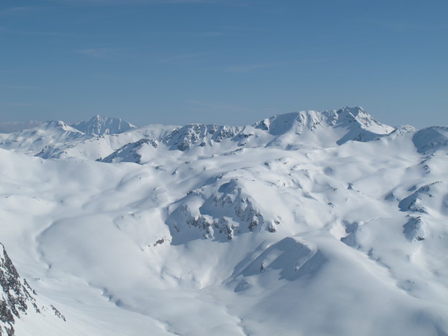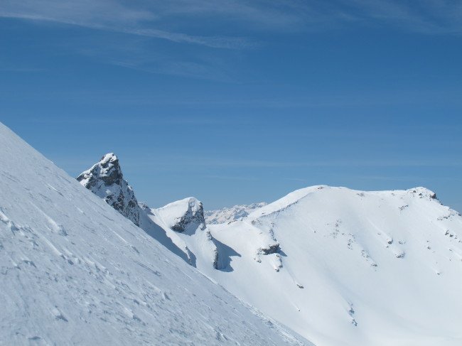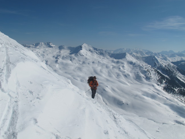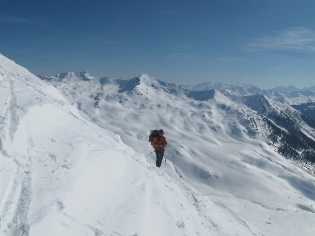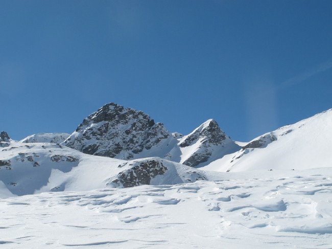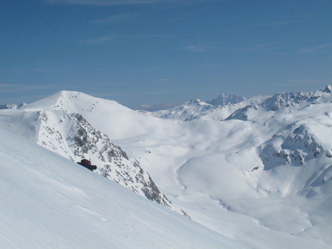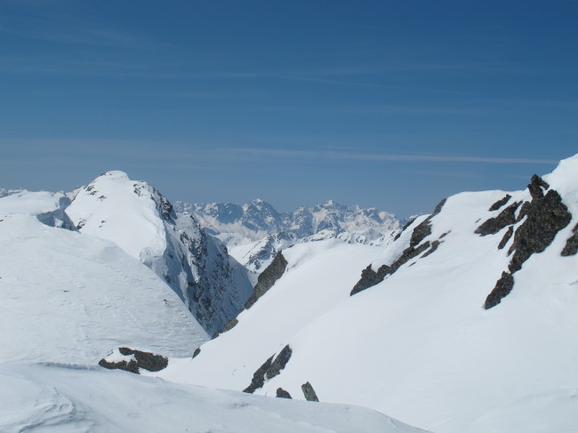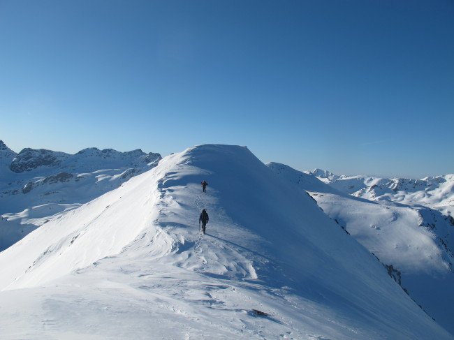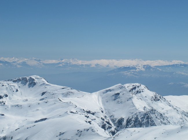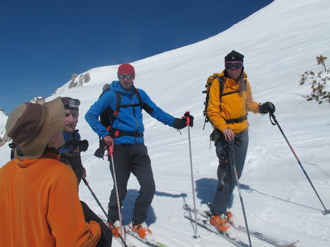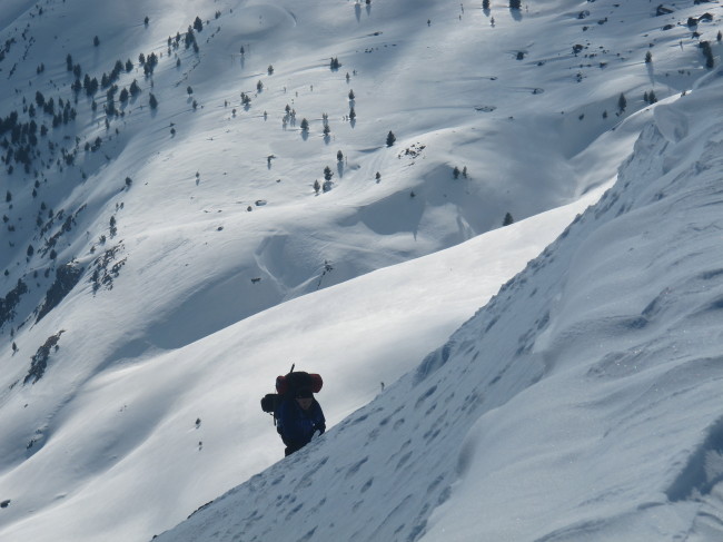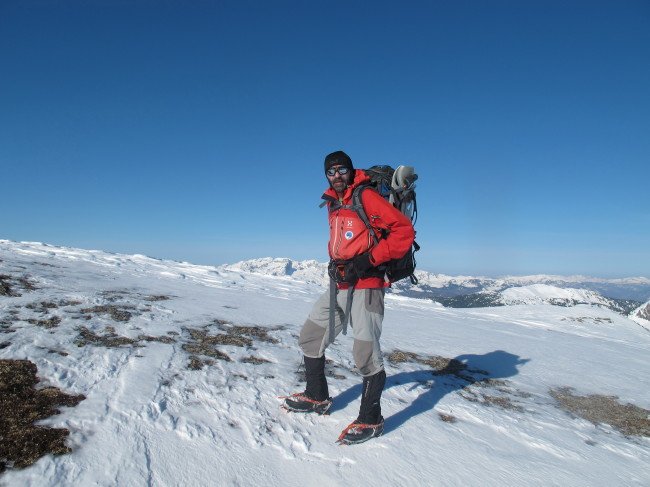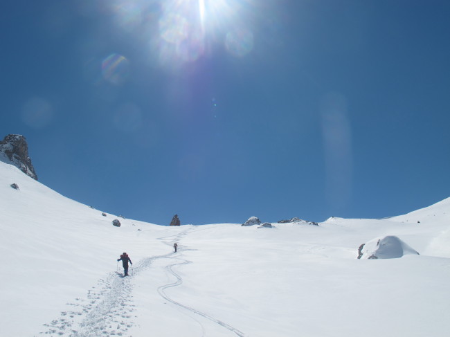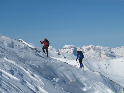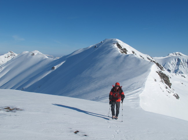 Boris i Fema brzo, grebenom, stižu na vrh Maja Ibard, a ja krećem u spuštanje, pa potom dugi marš dolinom koja, mnogo dalje, sjeverno, pada u kanjon Dečanske Bistrice. Kreću i prvi eksponirani usponi i često mijenjanje načina kretanja: skidanje krplji i stavljanje dereza i obrnuto. Sve to oduzima dragocjeno vrijeme. Snijeg je mekan i na pojedinim dionicama prtim, gubeći mnogo energije koju oduzima i jako zračenje sa nebeskog svoda.