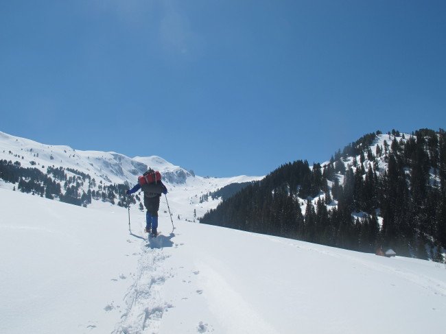 Ali, umor i premalo sna uslovili su da ustajanje, ipak, ne bude toliko rano. Skijaška ekipa je već na terenu. Mi se pakujemo, tovarimo preteške rance i krećemo, već sa malom nadom da možemo stići na cilj. A cilj je bio primaknuti se danas Škeljzenu, i sutra nastaviti na vrh… Jer, 8 h je prekasno za polazak na toliku udaljenost. Trebalo je krenuti znatno ranije. Uz to, ranci su preteški. Sve je tu: šatori, vreće, podmetači, užad, pojas, hrana, voda, gorionici… Hodamo na krpljama. Stanje snijega, takođe, nije idealno. Uostalom, kao i svih vikenda ove godine. Iako planine ove zime ne oskudijevaju snijegom, njegov kvalitet za hodanje i uspone je loš tako da smo, ove zime, „uhvatili“ samo jedan dobar vikend i to na Prenju u Hercegovini.