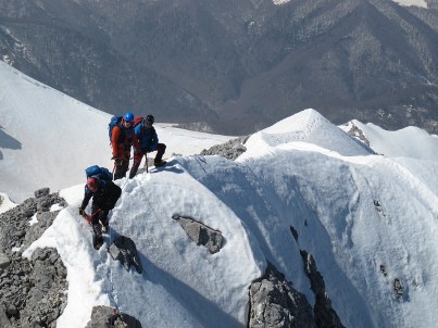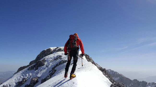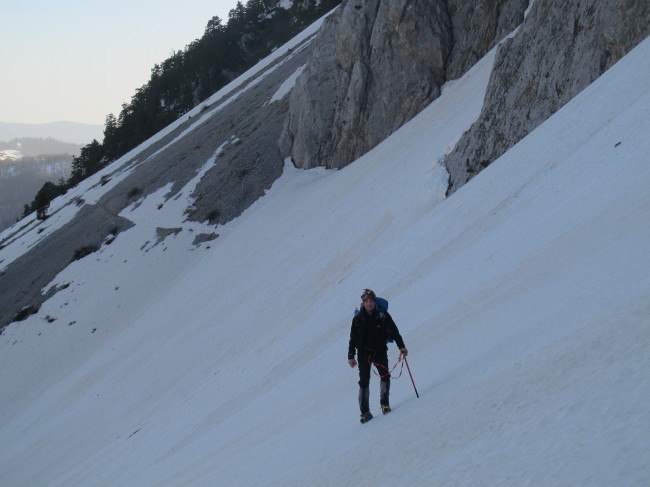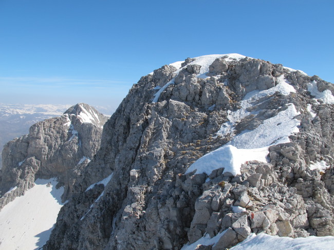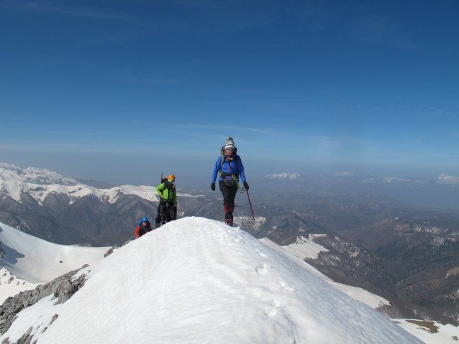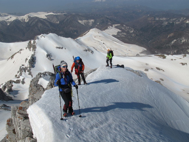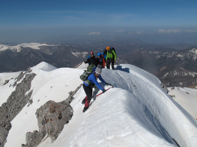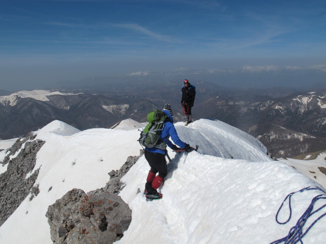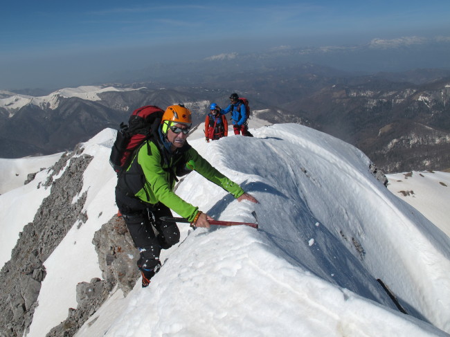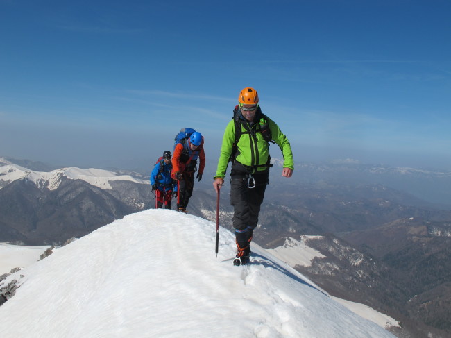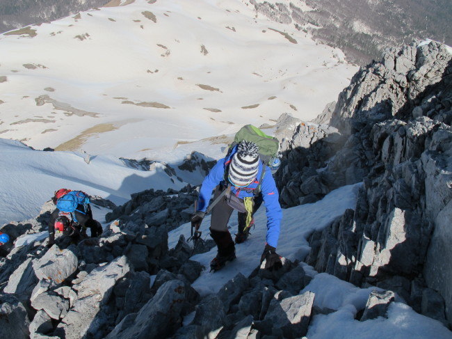 Oprezno prelazimo dio grebena koji je nešto širi i dolazimo do prve strehe. Procjenjujem da nije potrebno postavljati fix. Pravim stopnike u strehi hodajući bočno i osiguravajući se bajlom za, još uvijek prilično zaleđeni vrh strehe. Onda opet stjenoviti dio grebena sa koga je vjetar oduvao sniježnu kapu pa ponovo streha. Tu već procjenjujemo da je potrebno postaviti uže radi sigurnog prelaska jer taj dio treba preći bukvalno balansirajući ivicom sniježnog grebena. Pogled na jednu ili drugu stranu mora proizvesti malo straha i u takvoj situaciji sigurnost koju pruža činjenica da ste ukačeni na fiksno uže pomaže da taj strah ne parališe noge i osigura koncentraciju na naredni korak… Sve u svemu, jedna dionica koja je izazovna i upotpunjuje ukupnu sliku i zadovoljstvo učinjenim i savladanim usponom…