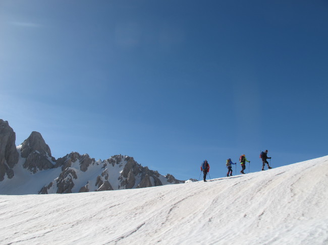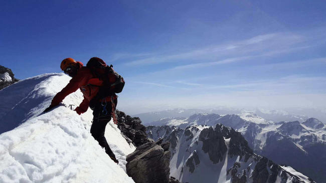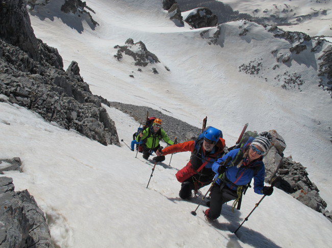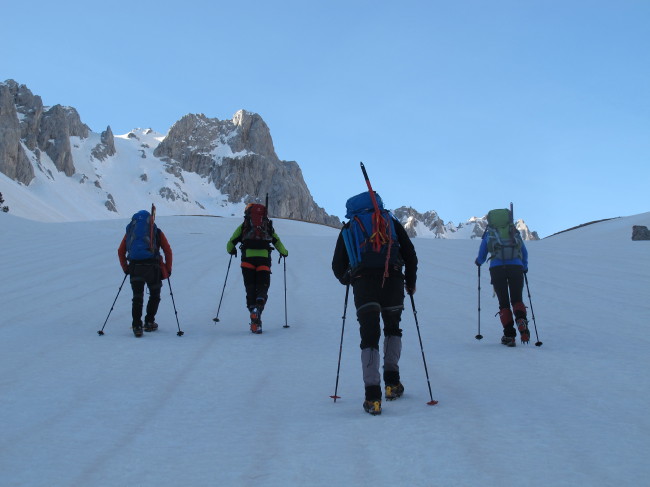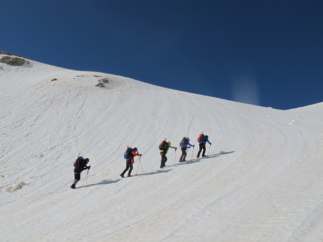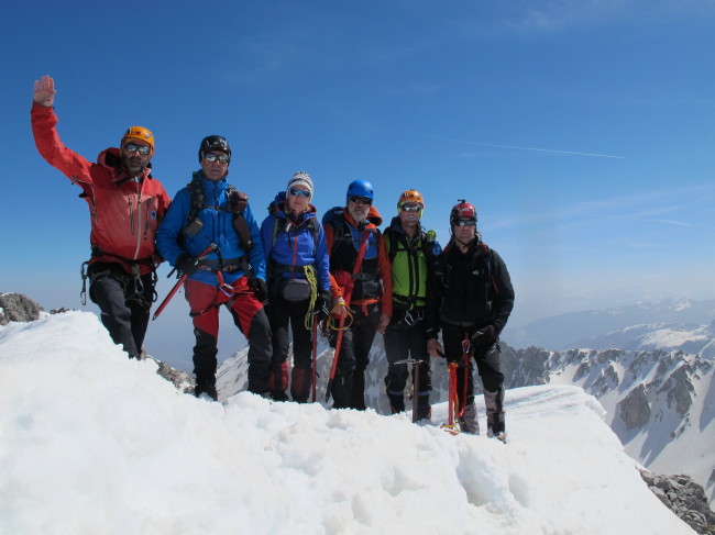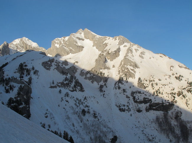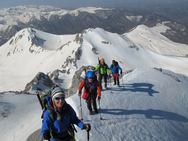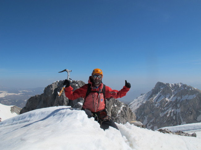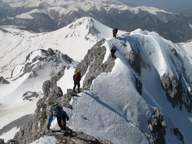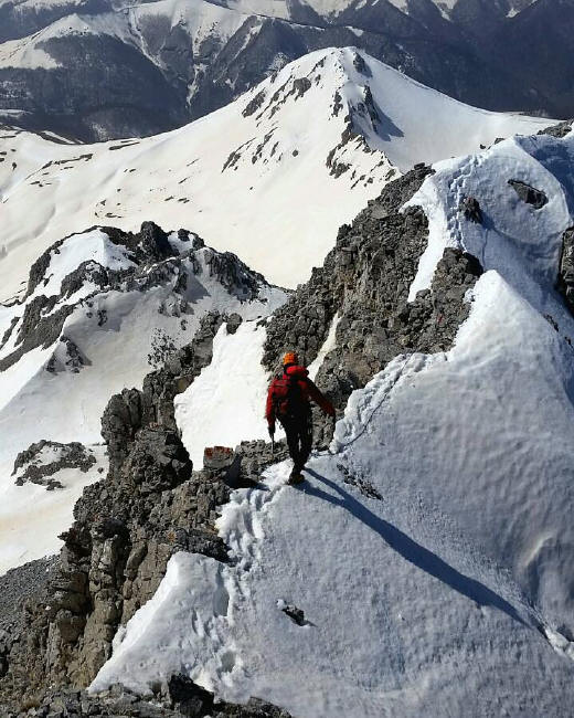 Oprezno prelazimo dio grebena koji je nešto širi i dolazimo do prve strehe. Procjenjujem da nije potrebno postavljati fix. Pravim stopnike u strehi hodajući bočno i osiguravajući se bajlom za, još uvijek prilično zaleđeni vrh strehe. Onda opet stjenoviti dio grebena sa koga je vjetar oduvao sniježnu kapu pa ponovo streha. Tu već procjenjujemo da je potrebno postaviti uže radi sigurnog prelaska jer taj dio treba preći bukvalno balansirajući ivicom sniježnog grebena. Pogled na jednu ili drugu stranu mora proizvesti malo straha i u takvoj situaciji sigurnost koju pruža činjenica da ste ukačeni na fiksno uže pomaže da taj strah ne parališe noge i osigura koncentraciju na naredni korak… Sve u svemu, jedna dionica koja je izazovna i upotpunjuje ukupnu sliku i zadovoljstvo učinjenim i savladanim usponom…
