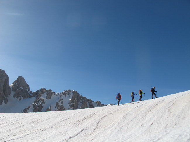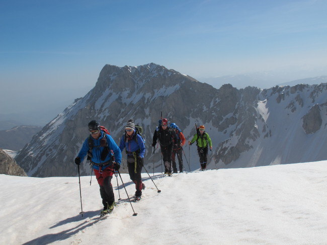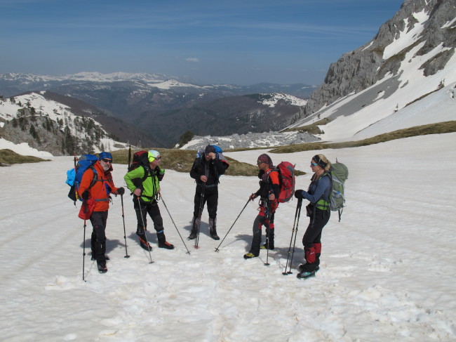 U povratku, snijeg je značajno mekši ali uspijevamo da greben savladamo bez najmanjeg problema i bezbjedno. U podnožju stijene, na visini od oko 2300 m pravimo prvu veću pauzu za objedovanje, odmor i uživanje na suncu…