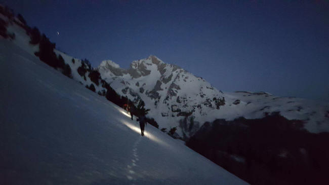 Zajedno sa četveročlanom ekipom koja ovog jutra penje Vasojevićki Kom krećemo iz Božićkog katuna na kome se nalaze Mikšine vikendice i odlazimo do livade Konjic u podnožju Vasojevićkog Koma gdje se razdvajaju ljetnje staze. Mi nastavljamo ljetnjom varijantom traverzirati prema Međukomlju. Ubrzo, već preko prvog sipara shvatamo da je greška što smo donijeli odluku da krenemo tim smjerom jer je strmina jako eksponirana i na dosta mjesta se ne može traverzirati normalno već otpenjavajući ili bočnim kretanjem uz zabijanje cepina do kraja što jako usporava kretanje i crpi snagu. Jedina povoljna okolnost je što je još uvijek mrak, snijeg u gornjim dijelovima je stabilan i drži tako da nema opasnosti od kamenih ili sniježnih lavina koje su ovdje česte kada sunce krene da „radi“ svoj posao…