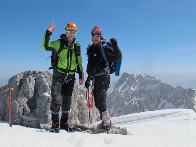 Cmika me osigurava dok prelazim ovaj dio grebena i na njegovom kraju pronalazim isturenu stijenu koja mi služi da postavim štand. Cmika to isto radi na svojoj strani grebena i, polako, jedan po jedan član tima, bezbjedno prelaze pod sami vrh.. Potom, nekoliko metara penjanja u stijeni i na vrhu smo pored metalne šipke na najvišoj tački mitskih Komova. Desetak minuta je prije 11 h, tačno po planu…