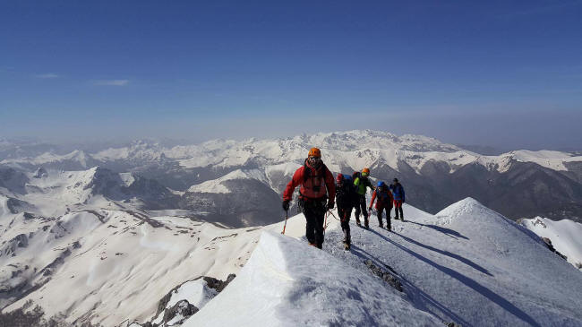Pod stijenu Kučkog Koma dolazimo oko 10 h, pratimo ljetnju stazu i prema grebenu penjemo direktno uz strmi sniježni jezik koji se zadržao u kuloaru, desno od stjenovite ljetnje varijante. Ne znamo šta nas čeka na grebenu, ali izlaskom gore doživljavamo novo oduševljenje. Pogled na sve četiri strane završava na planinama, bliže i dalje, ne znamo gdje prije pogledati. Nemamo puno vremena za uživanje u pogledu jer treba savladati najopasniji dio današnje avanture, vršni greben okićen oštrom sniježnom kapom koja izgleda poput onih italijasnkih kapa Musolinijeve vojske. Ne znam kako mi ona pade na pamet ali oštri brid sa čije se ivice strmoglavo spuštaju ambisi na obje strane pomalo izazivaju jezu i podsjećaju na tu kapu koju smo gledali u partizanskim filmovima…