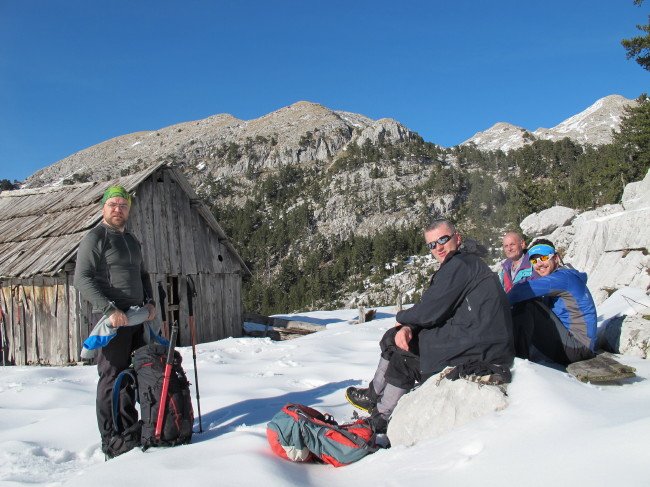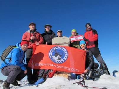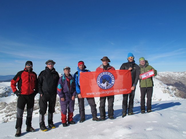 Pravi zimski uspon zapravo smo započeli tek od katuna Poljana (1595 m), odakle smo nastavili snijegom prošaranom južnom padinom prema Međeđem vrhu. Milan, Radisav, Ivo i Ja smo izveli prvo ponavljanje smjera “Božica” (prvi put penjan 2013.), dok su Boris, Janko i Marko u gornjem dijelu izašli desno iz smjera i popeli novi koji su nazvali “Mali maljugani”. Na Međeđem vrhu 2139 m uživali smo oko sat vremena u hrani i piću, te jasnim i prekrasnim vidicima na sve crnogorske planine od mora do Durmitora. Povratak je uslijedio uobičajenom rutom niz Čistu stranu pa preko katuna Maganik do Poljane, s tim što su Boris i Marko uhvatili neku prečicu direktno ispod Čiste strane do katuna Poljana. Konačno lijepi doživljaj ovog zaista prekrasnog dana upotpunili smo, đe bi drugo nego po starom dobrom običaju, u krčmi kod našeg prijatelja Raša u Međuriječju. Dok su se krčmom orile, srećom još nezaboravljene, pjesme poput one “Oj da mi te sresti neđe, u rovačke, mala, međe…”, pilo se pivo i rezala domaća slanina, a neki bogami nijesu odoljeli ni mirisu starog dobrog kotrobana.