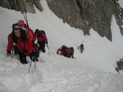 Poznati zvuk alarma se oglašava, 3 je sata ujutru i počinje šuškanje u vrećama, ustajanje i spremanje. U 3:50 smo ispred kuće, sa čeonim lampama i spremni za pokret. Nakon kratkog hodanja putem ulazimo u šumu, i sada bi trebalo pogoditi pravi put jer je magla veoma gusta a šuma savršen teren za dezorjentisanje. Na čelu kolone se smenjuju Đaja, kao iskusni lovac i planinar kome ovakve situacije nisu nepoznate, i Milan koji je išao jednom ovom stazom, mada leti. Odmah se videlo da je dug dan ispred nas jer je sneg mekan i stalno se mora prtiti. Prvo blagi uspon kroz sumu, iskljucivo vođeni intuicijom i nekom mogućom logikom, jer je orjentisanje nemoguće, zatim izuzetno eksponiran uspon za koji Boris kaže dal liči na Slovenski smer u severnoj steni Triglava, i nakon NEKOLIKO sati dolazimo na zaravan, ispred nas je ogroman pad koji ništa dobro ne obećava, odlučujemo da idemo levo ne bi li naišli na bilo kakav orjenir. Izlazimo na čistinu i u tom trenutku, kao nečijom rukom uklonjena, magla se spušta ispod nas i okomite stene i vrhovi se ukazuju. Kakav dar, kakva pomoć planine, konačno se možemo bar malo orjentisati. Upućujemo se desno, ka prevoju koji izgleda kao dobra opcija za priključivanje pravom putu. Uspon do prevoja je veoma težak, često se smenjujemo na vrhu kolone, mada svaki trenutak koristimo za uzdahe oduševljenja i fotografisanje, jer je prizor neprocenjiv. Magla je ispod nas, sunce izlazi, vrhovi se u daljinu promaljaju, dovoljno razloga da ispunjeni entuzijazmom gazimo dalje. Na samom prevoju shvatamo da se moramo spustiti nekih stotinak metara jer je direktan spust niz veoma strmu padinu nemoguć. Nakon spuštanja, zaobilazimo stenu, pravimo kratku pauzu za doručak i zatim brzo, koliko je to moguće kroz veoma dubok sneg, traverziramo preko potencijalno lavinozne strane, i izlatimo na čistinu odakle vidimo kuloar između dve stene. Tuda moramo proći kako bi izašli na Carev Do.