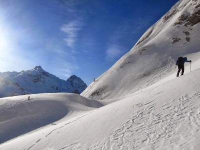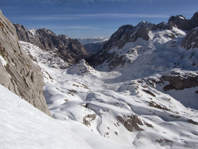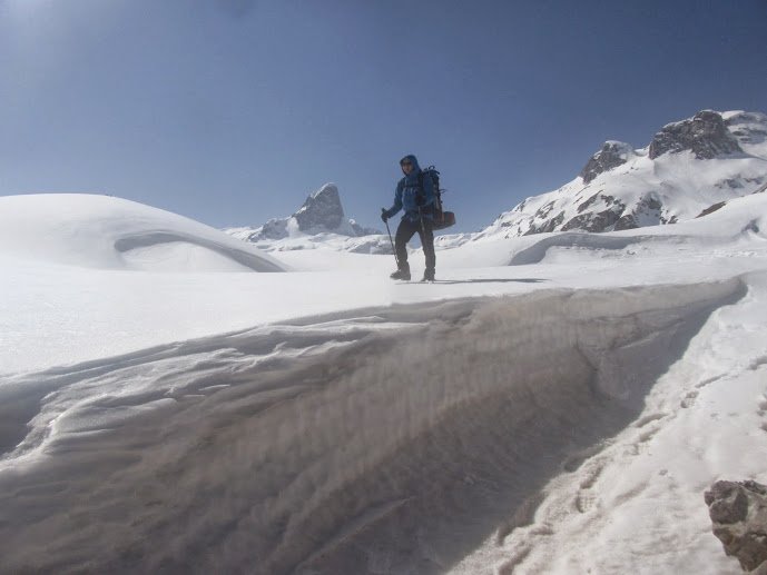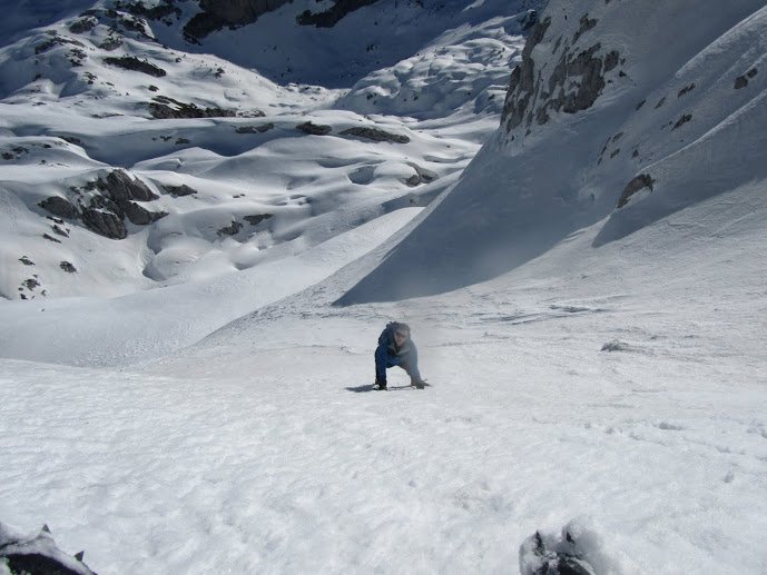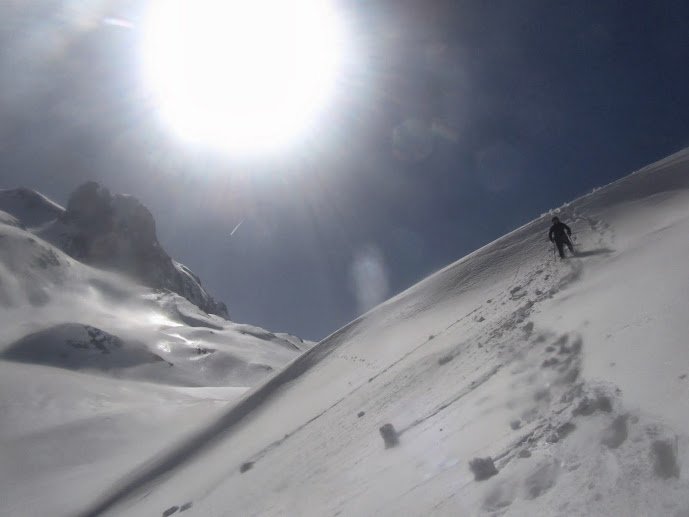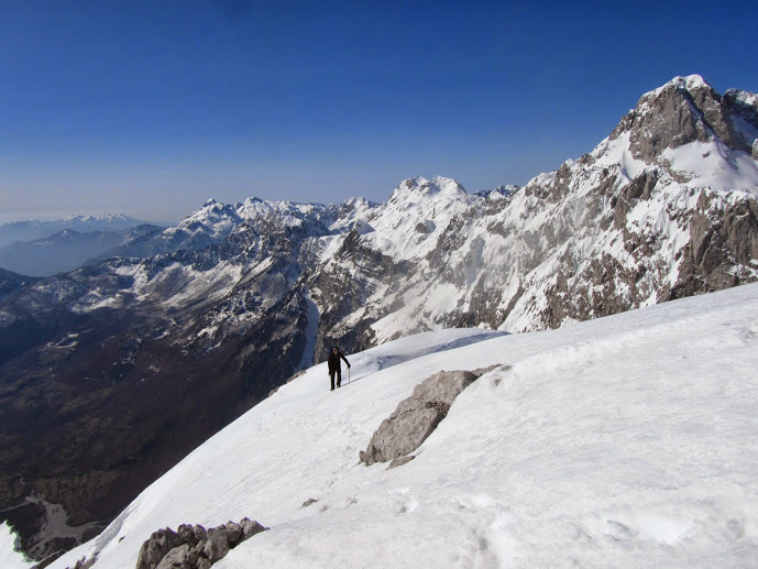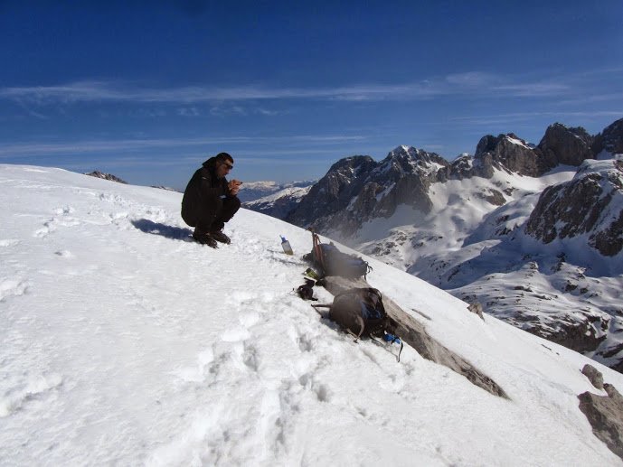 Ustajemo relativno kasno i oko 6,30 h krećemo na uspon. Topla noć navela nas je da odustanemo od zamisli da izvedemo zimski uspon na Popluks. Harapit je već u šest ipo grijalo sunce. Odlučujemo da idemo malo korigovanom rutom koju nam je predložio Ahmet Reković, a ne ljetnjom stazom i prilazimo mu sa sjeverne strane. Na pojedinim mjestima snijeg drži dobro ali većinom je loš. Dolazimo do ispod sjeverne stijene i zaobilazimo je sa lijeve strane ulazeći u široki kuloar koji je sjevero- istočno orjentisan i njime izlazimo na sedlo neposredno ispod vrha. Kuloar nije toliko strm koliko je loš snijeg, koji puni zubce od dereza i svako malo ih moramo čistiti. Uspon olakšavaju dvije alatke koje koristimo, bajla i cepin. Sa sedla idemo desno i prebacujemo se na u jugoistočnu stranu te traverziramo do grebena. Potom uz prilično isturenu padinu grabimo ka vrhu. Na jednom mjestu, ispod samog vrha, pukotina nas je malo zabrinula i unijela zebnju od lavina koju je podgrijavao i mekani sloj snijega od nekih 20 cm koji je prekrivao zaleđeni sloj koji ni glava cepina nije probijala. Ipak nas je blizina vrha od nekih 50 metara , natjerala da krenemo dalje. Poslije 2 sata i 45 minuta izlazimo na vrh. Pogled je prelijep, srećni smo zbog uspona, ali mislimo o povratku. Ne zadržavamo se dugo jer treba organizovati spuštanje po ovako lošim uslovima snijega. Pokušavajući da napravim postolje od ranca za samookidajuću fotografiju, fotoaparat „šaljem“ na putovanje od preko 200 metara sniježnim kuloarom od čega je 50 metara bio let preko stijene. U povratku ga nalazimo. Radi i dalje kao da se ništa nije disilo. Vraćamo se istom stazom, grabimo ka karuali vidno iscrpljeni. Razmišljali smo se da nastavimo na neki od okolnih vrhova ali kvalitet snijega je ubio svaku želju za planinarenjem.