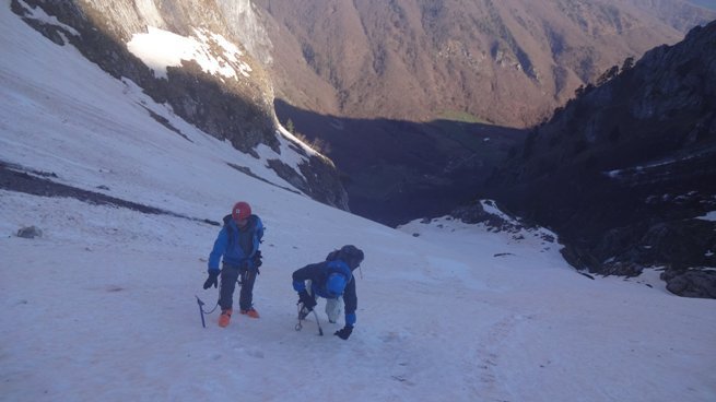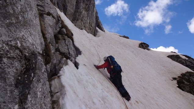 Nedelja. Krećemo u 7,30 h. Kiše nema a da li će je biti, vidjećemo. Snijeg nije dovoljno tvrd da se ne propada ali ne pravi veliki problem. Stižemo do stijene, do rampe preko koje treba krenuti gore. Odmah na početku je velika eksponiranost i dogovaramo taktiku. Snijeg je takav da nam sniježni klinovi neće biti od velike pomoći i moraćemo da pravimo štandove isključivo u stijeni. A svako ko je penjao Očnjak u ljetnjim mjesecima zna koliko je „prostora“ za tako nešto. Pravimo štand, cug vuče Marko, ja osiguravam. Kad Marko pronađe sledeći štand ja idem uz uže, Tihomir stoji na štandu i čeka. Kad ja stignem do Marka, kreće Tihomir, jedan od nas dvojice ga osiguravamo i kupimo uže. I tako, cug za cugom. Otprilike desetak cugova. Svakako ne manje. Prva dva cuga su, reklo bi se i najizazovnija. Eksponiranost je i do 70 stepeni, u cijelom smjeru u prosjeku 50. Najveći problem je u stvari odraditi prihvatljivo sidrište. Stijene su krušljive a i nema previše izbočina preko kojih bi mogli prebaciti gurtne. Na nekim mjestima uspijevamo ukucati klin, neki štand radimo pomoću zaglavaka i frendova. Uglavnom, na svakom štandu ostajemo značajno duže nogo što smo pretpostavljali. I penjanje je sporije. Svaki korak je, u ovakvom snijegu, novi napor i nova briga. Kako je sa stjenovitih vertikala sjurio snijeg na ovu rampu, tako je ona postala još zahtjevnija i strmija nego inače. Pri gornjoj ivici sniježne police, debljina sniježne ploče je do 8 metara! Toliko vidimo jer je sniježna ploča odvojena od stijene pod uticajem sunca zadnjih dana. Sa stijena kaplje otopljeni snijeg, sunce koje je obasjalo rampu, dodatno razmekšava snijeg i pretvara ga u kašu koja se mulja pod nogama. Nešto kasnije, navlače se oblaci, temperatura nešto pada, mada je generalno toplo, i kvalitet snijega postaje, koliko toliko, podnošljiv…