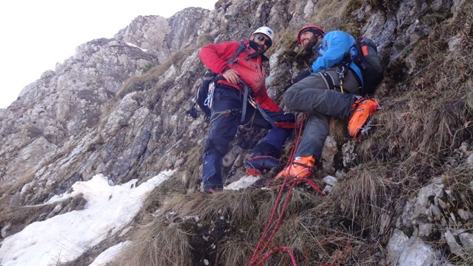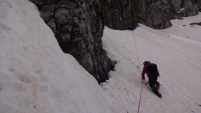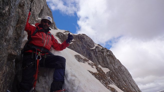 Negdje na trećem štandu ostajemo očajno dugo. Mix stijene, trave i tankog snijega u, skoro vertikali, traženje sidrišta, prečkanje tog detalja… Strpljenje je ovdje tako važno. Imamo ga, iako, već sada vidimo da sve ovo traje duže nego što smo očekivali. Obzirom da dvojica stoje na štandu do jedan penje, onda to nije više 500 metara visinskih sa početka priče nego je potrebno vremena kao da je u pitanju tri puta više… Rukavice su već natopljene toliko da se mogu cijediti. Sreća je samo što temperatura nije u minusu. U stvari, to je problem a ne sreća jer bi snijeg bio bolji da je u minusu i mogli bi praviti štandove pomoću sniježnih klinova. U stijeni, ukucan u pukotinu, pronalazimo zarđali, iskrivljeni klin. Koliko je godina čekao da ga neko pronađe? Vjerovatno su ga tu, prilikom zimskih uspona ukucali prokletijski doajeni, Blažina, Kotlajić, Gradišar… Vadimo ga za uspomenu i kolekciju u klubu.