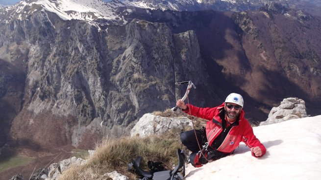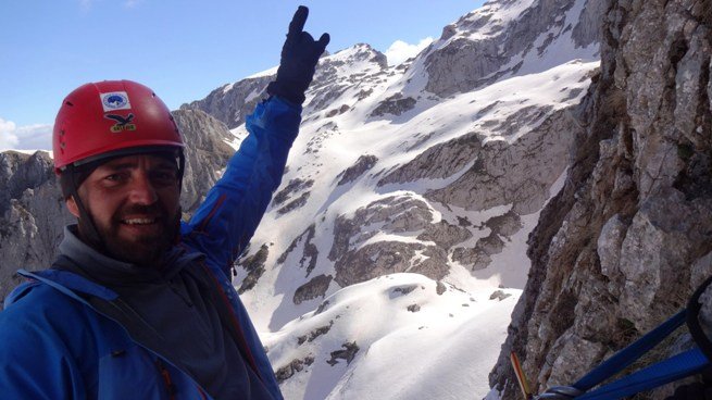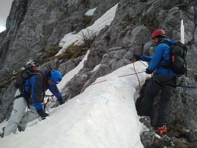 Stižemo na vidikovac (policu) gdje se završava sniježna rampa i kreće završni uspon od stotinak metara visinskih. Ulazimo u smjer. Dočekuje nas nova sajla koja je prošlog ljeta postavljena. Ali samo nekih četrdesetak metara visinskih. Kako god, dobro je, nema puno snijega, ne pravimo štandove već koristimo feratu na novoj i u gornjem dijelu staroj sajli. Na jednom mjestu ledena ploča zaustavlja napredovanje. Ponovo štand, ponovo propuštanje kroz osmicu da bi isprečkali nekih 5-6 metara do sledeće sajle. Krušljivo je, i pogled je, cijelo vrijeme prikovan za stijenu iznad. Na samom vrhu sniježna kapa i streha. Osiguravam Marka, razvlačimo fix, i potom i nas dvojica izlazimo na vrh. Već je 15,45 h. Od pravca istoka i juga kuljaju nekakvi oblaci, dunuo je vjetar, počinje da pada zvonasti snijeg. Onako mokri, nismo imali vremena ni da se radujemo izlasku na vrh. Dogovaramo samo jednu fotografiju i odmah kretanje dole. Računam da će nam silazak trajati mnogo, mnogo kraće i da ćemo prije potpunog mraka sići na sigurno. Stopnik je tu, vjerovatno nećemo morati da otpenjavamo sve vrijeme, štandove smo već definisali… Ali, sve bi to moglo biti tako, ali na nekom drugom vrhu. Ovo je Očnjak…