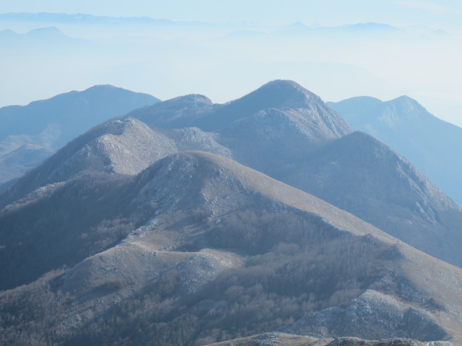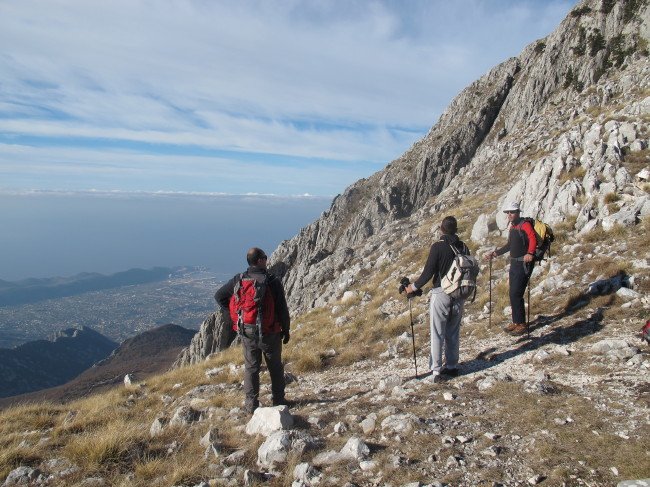 Iz sela, od ruske crkve krećemo tačno u 9 h. Iako su prethodnih par dana bili hladni, ovaj je pružao sve uslove za potpuno uživanje. Bez vjetra, bez hladnoće, sa dobrim pogledom. Lagano smo se penjali stazom,ne praveći velike pauze. Na prevoju gdje se spajaju staze koje dolaze sa dvije strane planine,morske i jezerske, dočekuje nas blaži vjetar, ali ništa strašno i ništa što bi nam pokvarilo užitak.