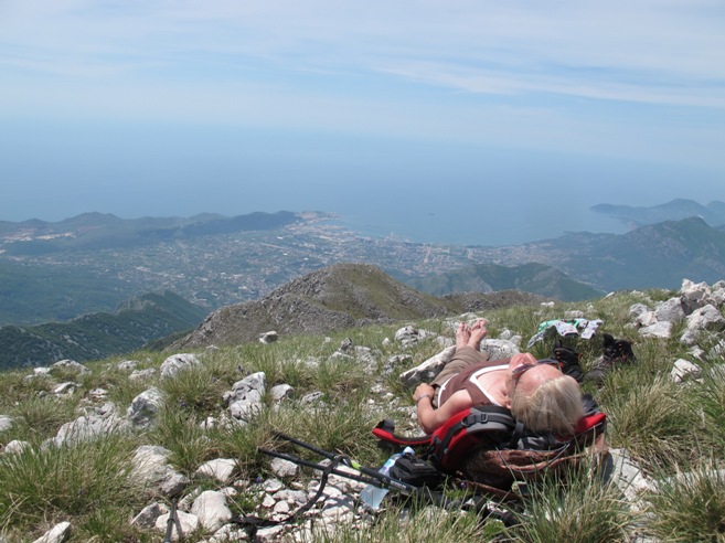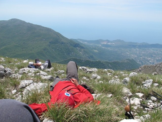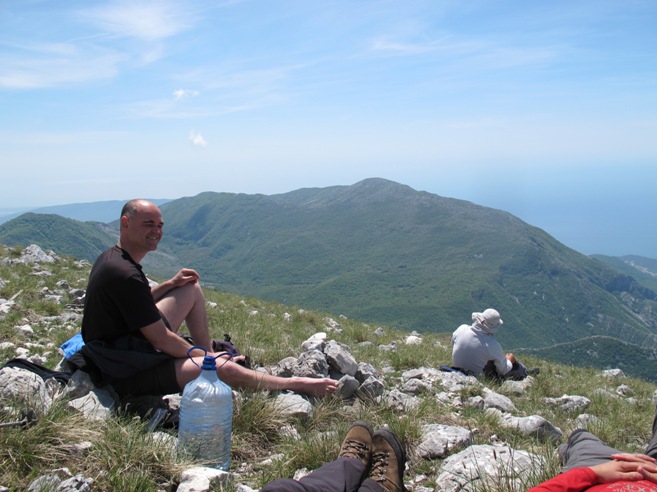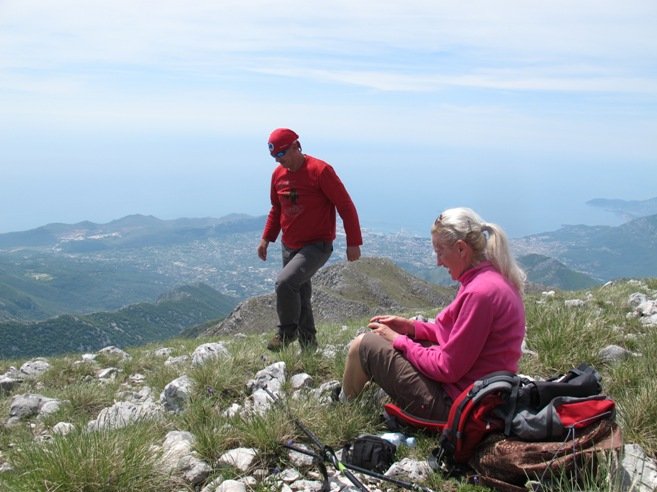 Nastavljamo prema vrhu Rumije, usput konstatujući da je neki medo bio prilično aktivan zadnjih dana jer je isprevrtao mnogo kamenja tražeći bube i mrave. Na vrh izlazimo u 12,45 h, nakon 4 sata uspona. Na vrhu zatičemo grupu planinara iz podnožja Rumije iz Satrog Bara koji su stigli ovdje prvi put nakon 10 godina. Oni ubrzo odlaze a mi ostajemo izvaljeni na južnoj padini ispod crkve, odmarajući i uživajući u pogledu na luku i more. Slika koja očarava, plijeni, odmara. Uz blagi vjetar na vrhu, zvuk ptičijih krila i zujanje insekata, uživamo u prirodi, u svim tim slikama i zvukovima koje samo planina nudi i omogućava. Zato smo svi zadovoljni i ne osjećamo umor iako, nakon jučerašnjeg napornog dana nije bilo lako donijetio odluku da se krene na novi uspon od 1100 metara visinske razlike. Na vrhu ostajemo preko sat i petnaest minuta prepustivši se vibracijama planine i potrebi da uživamo u miru koji se razliva planinom i našim tijelima.