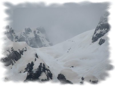 A na Karanfil Ljuljaševića krenulo je nas 20, sutradan u pet časova, predvođeni vodičima Milanom i Đajom, a s namjerom da savladamo 1070 m visinske razlike. Ali snijeg je bio vlažan i ljepljiv, tako da nije dolazila u obzir planirana varijanta. Zato je Đaja zaključio da je najpovoljnije da počnemo uspon uz jedan sipar, a nastavimo susjednom šumom. Pošto je šuma bila jako strma, prelazili smo je poprijeko, još prtinom koju nam je pravio vodič ni teško ni opasno. Da ne postoje takozvani vrućci u snijegu. To vam je ono kad se, iz manje-više nepoznatog razloga, na nekom mjestu istopi snijeg do određene visine ili ga neka prepreka spriječi da tu napada. Što u oba slučaja znači da imate sakrivenu rupu u snijegu. Koju vaša noga nepogrešivo nađe. Mislim, moja noga.