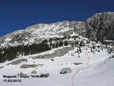 puta peli smo prvenstvenim smjerom kome smo dali ime »Vukadin« (prikazanim na slici) direktno iz katuna prema prevoju između Malog i Međeđeg vrha. Nakon savladavanja veoma strmog sipara prekrivenog debelim slojem snijega stigli smo do kuloara koji vodi na prevoj, međutim ispostavilo se da u njemu nema dovoljno snijega, te da u gornjem dijelu postoji visoka stjenovita kaskada, zato smo odlučili dalje peti lijevom stranom pored kuloara i pokušati izaći na prevoj. U prvi mah je izgledalo jednostavnije nego što se kasnije ispostavilo. U pitanju je bio miks (stijena, trava, snijeg) sa nekoliko zahtjevnih alpinističkih detalja koji su zahtijevali dobru koncentraciju, tim prije što smo solirali. Uveliko se približavalo podne, pa je ono malo snijega što se zadržalo u tom dijelu omekšalo i nije baš ulivalo povjerenje, zato smo se kad god je bilo moguće više držali suve stijene. Pošto smo izašli na prevoj preostao nam je lakši dio posla koji se sastojao iz 30-ak minuta ugodnog penjanja grebenom Međeđeg vrha. U 12 h i 45 minuta, nakon sedam sati napornog penjanja, čestitali smo jedni drugima još jedan uspješan uspon. Centralna pozicija Maganika i dobro vrijeme omogućili su nam jasne i prekrasne poglede na sve crnogorske planine. Sa vrha smo se strmim kuloarom spustili direktno u Maganički katun, a onda nastavili dalje prema katunu Poljana i selu Granica. Kod auta smo stigli u 6 h i 45 min., poslije 13 sati napornog planinarenja iscrpljeni, ali veoma zadovoljni obavljenim poslom. Bio je ovo još jedan dobar trening za „Visokogorce“ u okviru priprema za pohod na Aljasku.