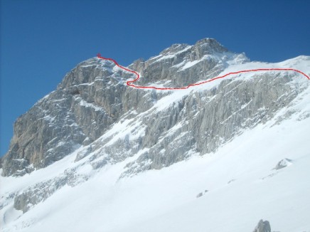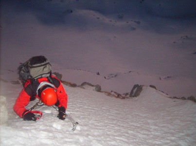Napredujemo stopu po stopu. Snijeg, malo je reći loš. Potpuno prosut. Upada se skoro do koljena. Bajle zabadamo čitave u snijeg svjesni da od nekog kvalitetnog osigaranja nema baš nista. Loš snijeg biva jednostavno odnešen Bojanovim stopama tako da meni ne preostaje ništa nego praviti nova gazišta. Ispod nas vertikalna odsiječena padina izaziva blagu jezu, ali istovremeno pomaže da držimo koncentraciju i vodimo računa o svakom koraku koji slijedi. Stižemo do najzahtjevnijeg detalja kada treba preći iz lijeve traverze u desnu policu ne širu od jednog metra i nagiba oko 55 stepeni. Ovaj dio predstavlja klasičan miks stijene i lošeg snijega. Po prelasku tog detalja slijedi kuluar direktno naviše I blago udesno. Tu konačno nailazimo na solidan snijeg . Dereze ovdje dobro drže a “alatke” ulivaju samopouzadnje. Tu pravimo malu pauzu za slikanje i jednu Guaranu za osvježenje. Nastavljamo penjanje i uskoro dolazimo do pod vršni plato od koga traveriramo ulijevo do malog sedla pod samim vrhom. Krećemo dalje i opet nailazimo na problem. Snijeg opet loš, mek. Upada se do koljena. Stvarno ne mogu vjerovati da na 25000 m i na ovako niskoj temperaturi snijeg bude tako mekan. Izlazimo iz zadnje lijeve traverze u samo svitanje. Tu nas dočekuje četvrta etapa ovog uspona. Dvadesetak metara miksa koje traba prepenjati do vrha. Pravimo malo zaobilaženje grebena i nakon par metara miksa nalazimo se na tako poznatom mjestu.