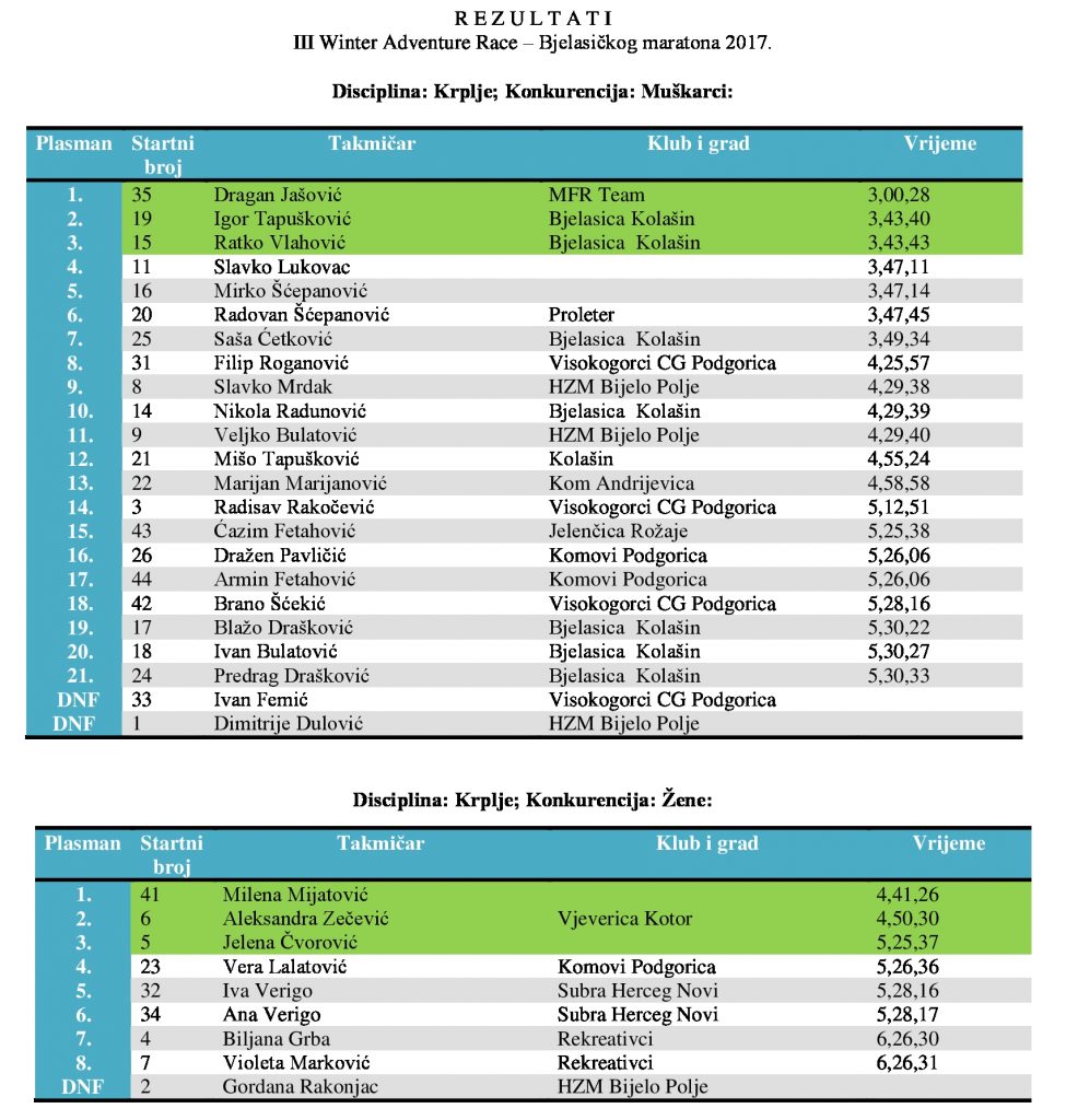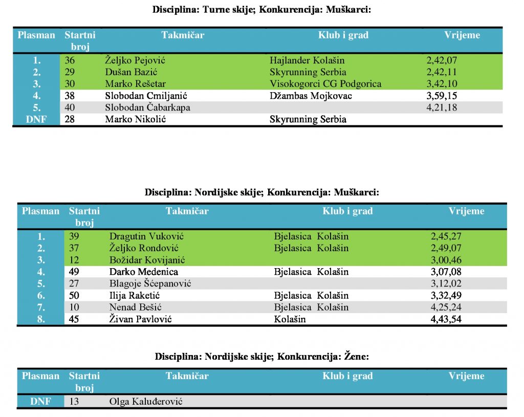 Na trci u tri discipline (krplje, nordijske skije u turne skije) učestvovala su 47 takmičara, 37 muškaraca i 10 žena. Staza je bila zajednička, dužine oko 19 km i visinske razlike oko 900 metara. Na stazi je bilo postavljeno 5 kontrolnih tački i takmičari su imali zadatak da prođu pored svake od kontrola i stignu na cilj koji je bio na skijalištu Jezerine kao i start. Stanje snijega ove godine je bilo povoljno za takmičare, ali je vremenska situacija u višim predjelima bila otežavajuća. Zbog niske oblačnosti, takmičarima nije bilo lako pronaći kontrolne tačke. Ali, i to je sastavni dio i izazov avanturističke trke. Takmičenje je proteklo u najboljem redu, bez ijednog incidenta i sa potpunim poštovanjem propozicija od strane svih takmičara. Takmičarski duh je bio na najvećem nivou a konkurencija izuzetno jaka o čemu svjedoče pobjednička vremena. Na kraju takmičarskog dana, organizovali smo druženje i dodjelu pobjedničkih priznanja u kolašinskom restoranu “Planinar” čime je okončana manifestacija koja će dobiti tradicionalni karakter, a, nadamo se i svoje pristalice iz regiona i šire.