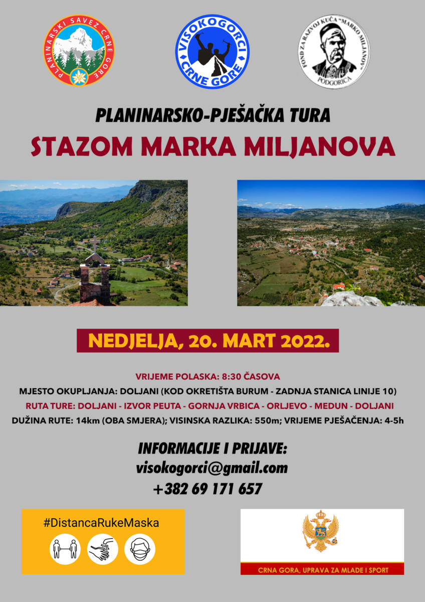 NaslovnicaNovostiNajava aktivnosti U susret proljeću ” Stazom Marka Miljanova” 18. 03. 2022. 49 PK Visokogorci Crne Gore u saradnji sa Planinarskim savezom i Fondom za razvoj Kuča “Marko Miljanov” pozivaju vas na planinarsko-pješačku turu “Stazom Marka Miljanova” u nedjelju, 20. marta 2022. godine sa polaskom u 8:30 časova. Dijeliti FacebookTwitterPinterestLinkedinViberCopy URL Prethodni članakOdržan “VIII Bjelasički Maraton 2022.”Naredni članakPodizanje konstrukcije doma “Maganik” Povezani članci Aktuelno Pozivamo vas na “Dječiji tabor na Maganiku 2025.” Najava aktivnosti U susret proljeću “STAZOM MARKA MILJANOVA” Izvještaji Održan 11th „Winter Adventure Race – Bjelasica 2025“ NAJNOVIJE Aktuelno Pozivamo vas na “Dječiji tabor na Maganiku 2025.” Najava aktivnosti U susret proljeću “STAZOM MARKA MILJANOVA” Izvještaji Održan 11th „Winter Adventure Race – Bjelasica 2025“ Novosti “XI BJELASICA WINTER ADVENTURE RACE” POZIV Novosti “NOĆNA TRANSVERZALA VUKOTICA – MAGANIK” poziv Učitati više